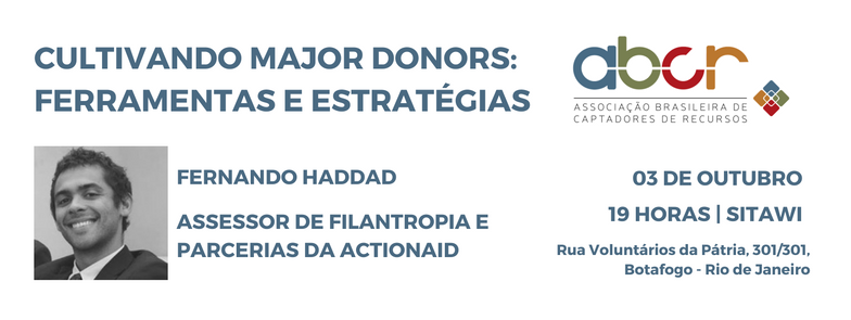 Na data será promovida a palestra Cultivando Major Donors: ferramentas e estratégias, que ministrada por Fernando Haddad, Assessor de Filantropia e Parcerias da ActionAid.
