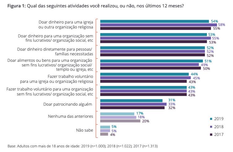 Dentre as várias modalidades de doação filantrópica que os brasileiros fizeram no ano passado, uma das principais é a doação de dinheiro, mas também se inclui o voluntariado, doação de alimentos e outras forma de doação direta a pessoas necessitadas, a igrejas ou a organizações da sociedade civil.