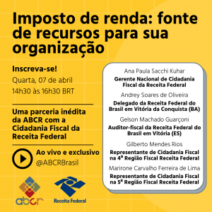 A ABCR e a Cidadania Fiscal da Receita Federal realizarão o evento online Imposto de renda: fonte de recursos para sua organização, na tarde do dia 07 de abril, para abordar o tema da doação de imposto de renda.